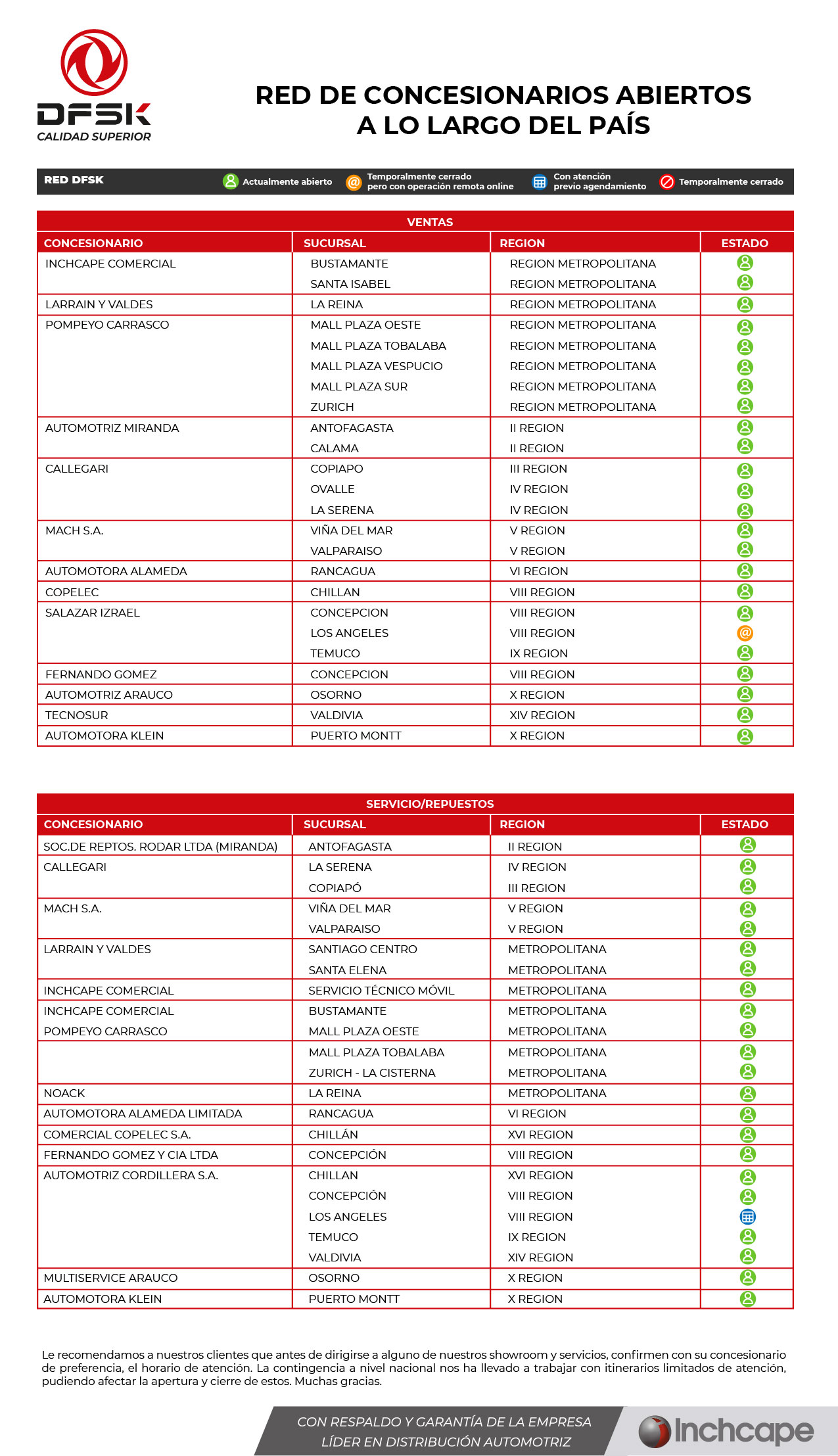 Debido a la contingencia nacional y para mantener nuestra atención de manera segura, los invitamos a informarse de nuestros Concesionarios que están abiertos y no afectos a la cuarentena por comunas.